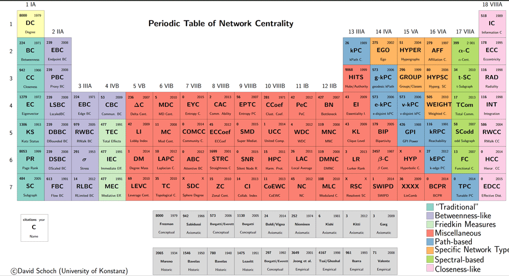 There is a multitude of measures in social network analysis (SNA). In other social sciences, great lengths are gone to develop robust and valid measures, with discrete validity, which means there are relatively few overlapping constructs; and some remain standard for decades. Not so in SNA. Take the measure of centrality, a basic building block; which essentially identifies the most important nodes / vertices in a network. The most basic one is degree centrality, which just counts the number of links a node has. The more links, the more popular. But there are others. Many others.