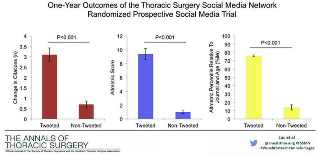A recent study on a randomized study, where half of a sample of published articles were tweeted by an influential account, the other half, did not get this benefit. The results indicate an average of 2,4 more citations after one year for the Tweeted articles.